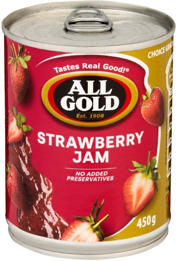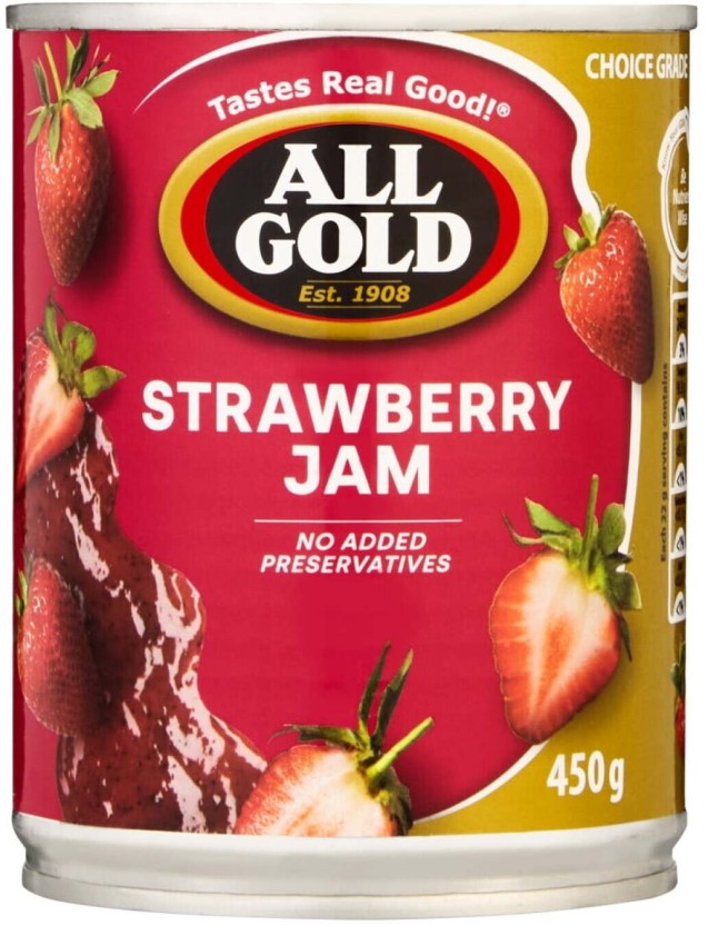 All Gold Strawberry Jam 450 g is made from luscious strawberries for a sweet, fruity taste that spreads perfectly on bread, pancakes, or scones. A classic favourite for any kitchen.