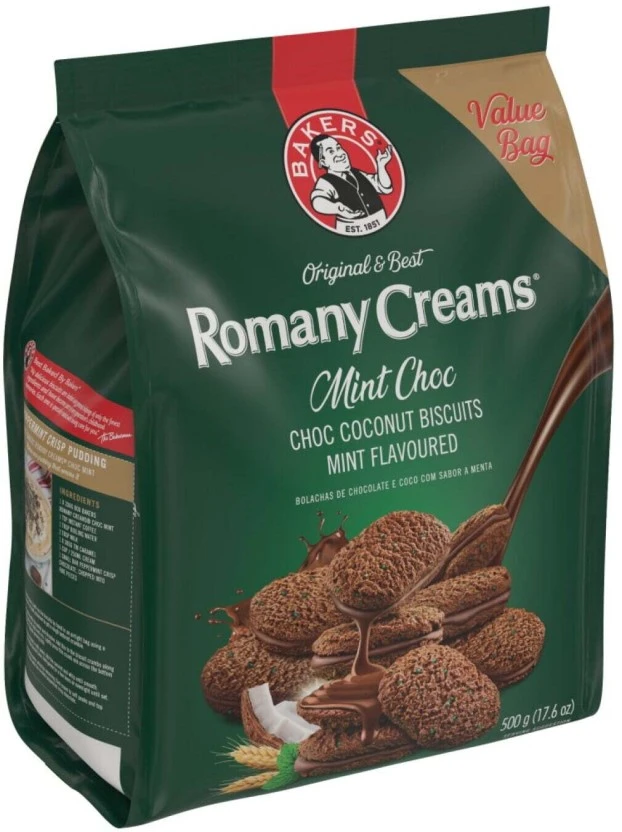 Indulge in the classic taste of Bakers Mint Choc Biscuits. This generous 500g pack features crispy chocolate biscuits sandwiching a thick, smooth, and refreshing mint cream filling, creating the perfect balance of cool mint and rich cocoa for an unforgettable snacking experience.