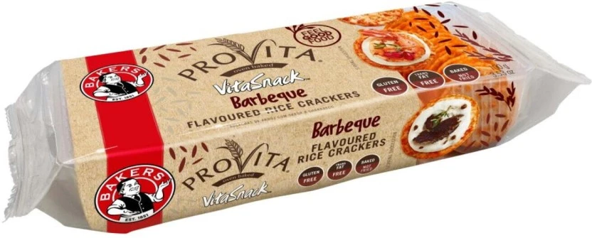 Brand: Bakers Type: Provita Vitasnack Barbaceque Flavoured Rice Cracker Size/Pack: 100 g Product Name: Bakers Provita Vitasnack Barbaceque Flavoured Rice Cracker. Pack Size: Single 100 g unit package. Usage Suggestions: Enjoy straight from the bag, or serve alongside cream cheese, chunky salsa, or fresh guacamole for a dynamic appetizer.