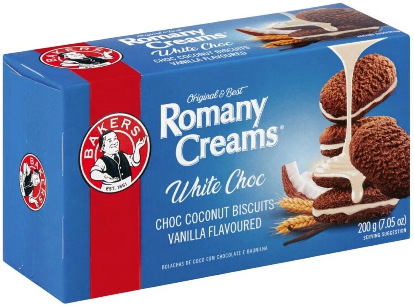 Bakers Romany Creams White Choc Coconut Cream Filled Biscuit (200 g) | Shop Online