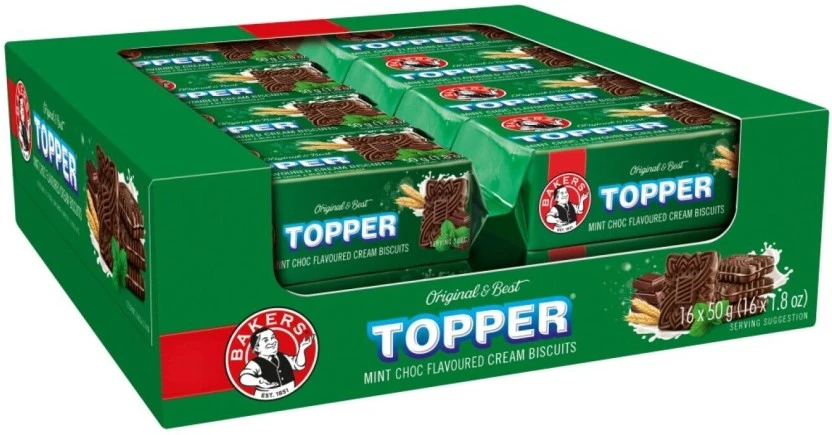 Product Format: This is a single unit pack containing 16 individual packets of Bakers Topper Mint Choc Flavoured Biscuits, each weighing 50g.