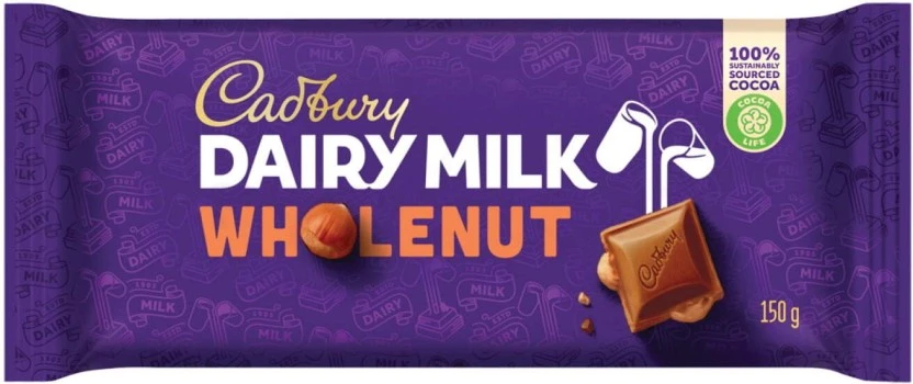 Brand: Cadbury Type: Dairy Wholenut Milk Chocolate Slabs Size/Pack: 20 x 150 g Product Type: Dairy Wholenut Milk Chocolate Slabs (Standard Variant). Net Weight: Total weight of 3 kg (20 slabs x 150 g each). Storage Instructions: Store in a cool, dry place (ideally between 15°C and 20°C) to maintain the chocolate's texture and prevent blooming.