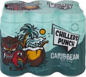 Chillers Punch Peach & Mango Spirit Cooler is a fruity, lightly alcoholic drink with tropical peach and mango flavors. The 6-pack of 440 ml bottles is perfect for parties or casual enjoyment.