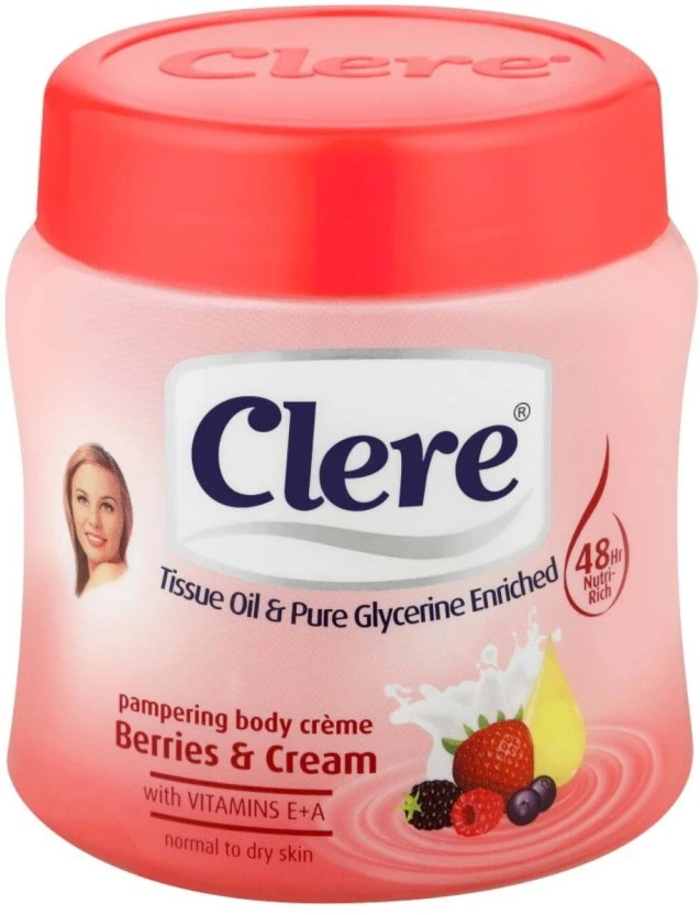 Indulge your skin with the luxurious Clere Berries Pampering Body Cream. This 300 ml moisturizing powerhouse is infused with a sweet, vibrant berry fragrance and enriched with vitamins, providing intense 24-hour hydration to leave your skin feeling irresistibly soft, smooth, and radiant.