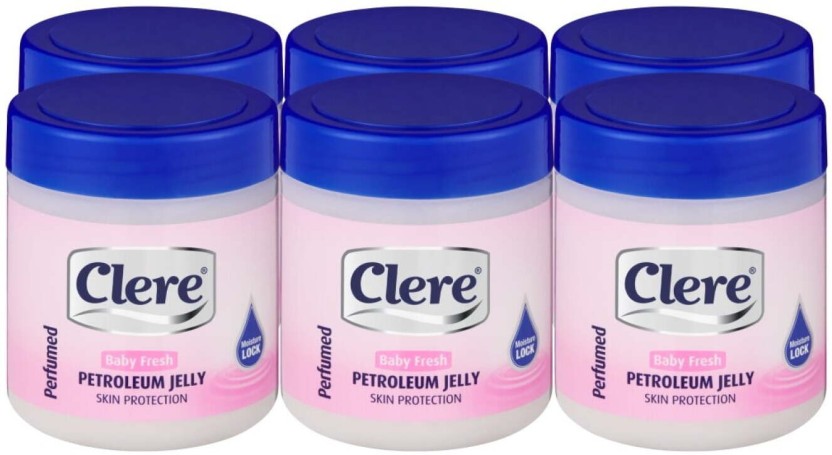 Clere Perfumed Baby Fresh Petroleum Jelly moisturizes and protects delicate baby skin. Infused with a gentle fragrance, it keeps skin soft, smooth, and pleasantly scented while preventing dryness. Ideal for daily use in a convenient pack of 6.