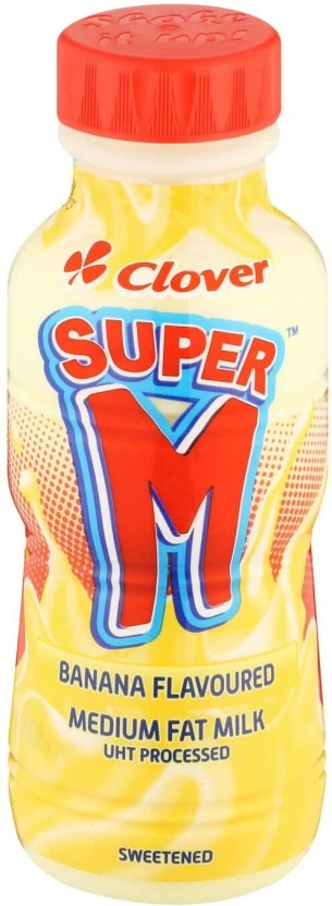 Brand: Clover Type: Super M Flavoured Medium Fat Milk, Banana Flavour Size/Pack: 24 x 300 ml Each purchase contains one carton consisting of 24 individual 300 ml bottles of Clover Super M Banana Flavoured Milk. This product is UHT treated (long life) for extended shelf stability; ensure it is stored in a cool, dry place until opened. For the ultimate enjoyment, this flavoured milk is best consumed chilled; remember to shake well before opening to maximize flavour and consistency.