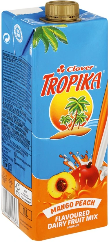 Indulge in the lush, tropical escape of Clover Tropkia Mango Peach Flavoured Dairy Fruit Mix. This 1-liter carton delivers a creamy, exotic fusion of sun-ripened mango and sweet peach, making it the perfect refreshing treat or breakfast companion.