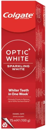 Reveal a sparkling, white smile with Colgate Optic White Sparkling Toothpaste. This 75ml tube is formulated with a unique micro-polishing formula that helps to remove surface stains and polish your teeth for a sparkling, clean finish. It’s a great way to get a brighter smile with every brush.
