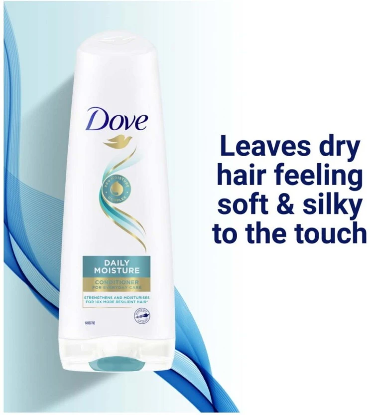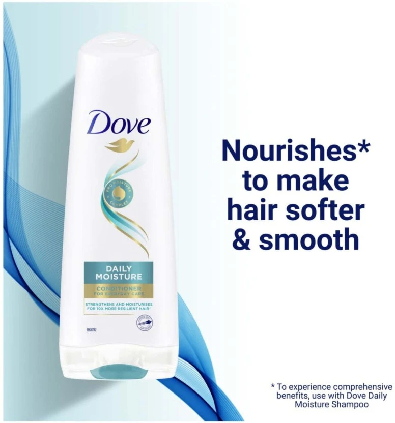 Brand: Dove Type: Daily Moisture Conditioner Size/Pack: 350 ml Product specifications: Standard variant, 350 ml single unit bottle of Dove Daily Moisture Conditioner. Usage instructions: After shampooing, apply the conditioner to wet hair, focusing on the mid-lengths and ends. Leave in for 1-2 minutes and rinse well. Developed by Dove, this essential hair care product is designed to be paired with Daily Moisture Shampoo for comprehensive moisturizing results.