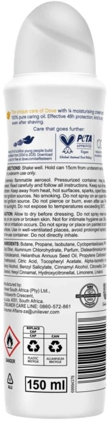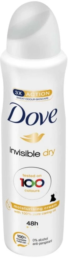 Step out in any color with absolute confidence using Dove Invisible Dry Anti-Perspirant Deodorant Spray. This 150ml formula is clinically proven to leave no white marks on 100 different colors while delivering 48-hour powerful protection and caring for your underarms with Dove's signature 1/4 moisturizing cream.