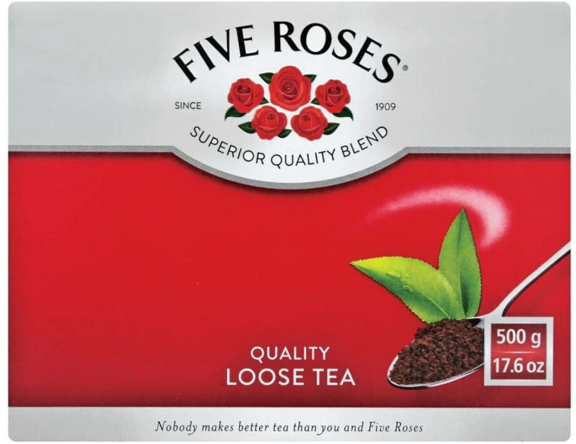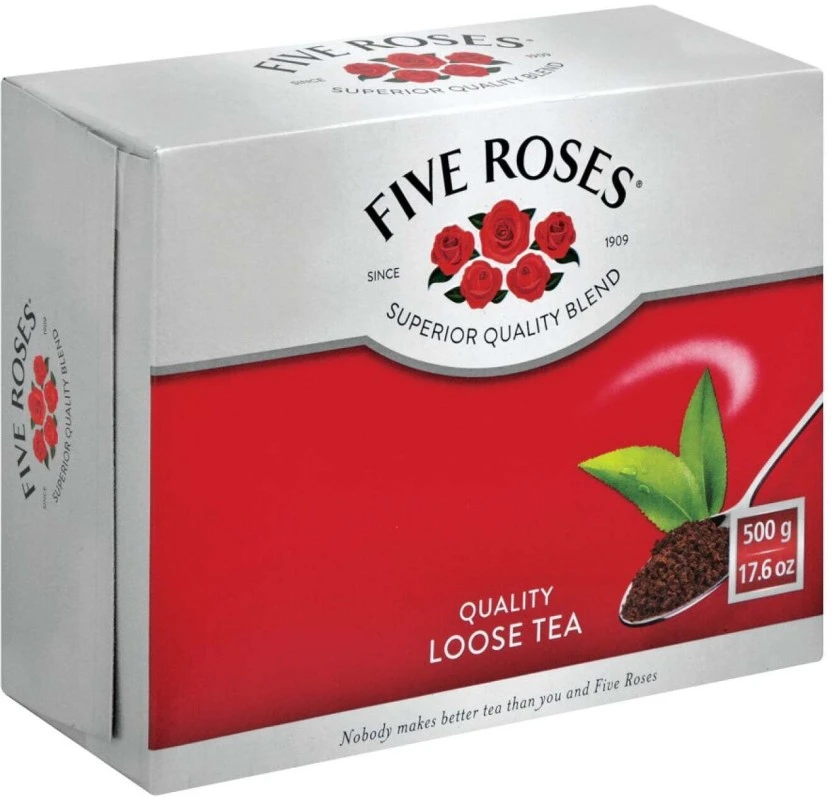 Brand: Five Type: Roses Superior Quality Loose Leaf Black Tea Box Size/Pack: 12 x 500 g Trusted Brand Heritage: Five Roses is a recognized brand known for consistently delivering high-quality beverages and pantry staples. Simple Brewing Instructions: Use 1 teaspoon of loose leaf tea per cup, steep with freshly boiled water for 3 5 minutes, and strain. Storage Recommendation: Keep the boxes stored in a cool, dry environment, away from direct sunlight and strong odors, to preserve the tea's natural quality.