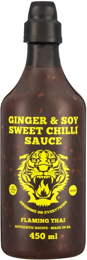 Ignite your meals with the Flaming Thai Ginger & Soy Sweet Chili Sauce. This 450ml bottle offers an irresistible, dynamic blend of traditional Thai sweetness, warm savory soy, and a distinct ginger zing, culminating in a satisfying 'Flaming' kick of heat. It's the ultimate all-purpose dipping and cooking sauce.