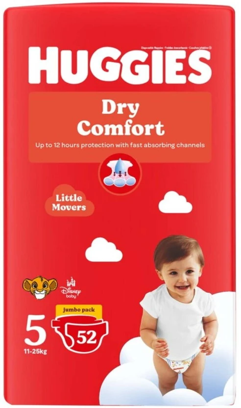 Huggies Dry Comfort Tape Diapers Size 5 provide excellent protection for older toddlers with active lifestyles. The fast-absorbing core locks in moisture while the soft inner lining ensures comfort for sensitive skin. Adjustable tape closures give a snug, flexible fit. The jumbo pack offers long-lasting convenience for parents who need reliable diaper coverage.