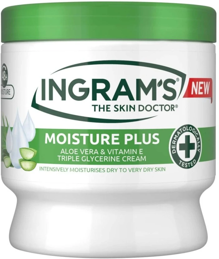 Brand: Ingram's Type: moisture Plus Aloe Vera & Vitamin E Triple Glycerine Cream Size/Pack: 450 ml Product Type: High-performance moisturizing cream specifically formulated for severely dry, rough, or damaged skin. Application Instructions: Apply generously to the skin daily. Massage gently until the cream is fully absorbed, focusing on extremely dry areas like elbows, knees, and heels. Brand Heritage: Ingram's is a trusted name in specialized skincare, known for creating reliable, generation-proven products designed to tackle challenging skin conditions.