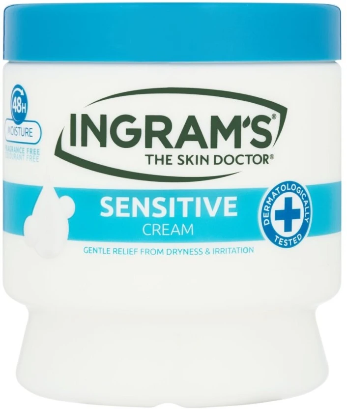Brand: Ingram's Type: Sensitive Cream Size/Pack: 450 ml This standard variant of Ingram's cream is highly recommended by dermatologists for individuals managing dryness, sensitivity, or conditions like eczema. Application: Massage gently into the skin daily, focusing on areas prone to dryness or irritation, for continuous relief and protection. Product Details: Single 450 ml jar of Ingram's Sensitive Cream, offering premium quality and efficacy from a trusted brand.