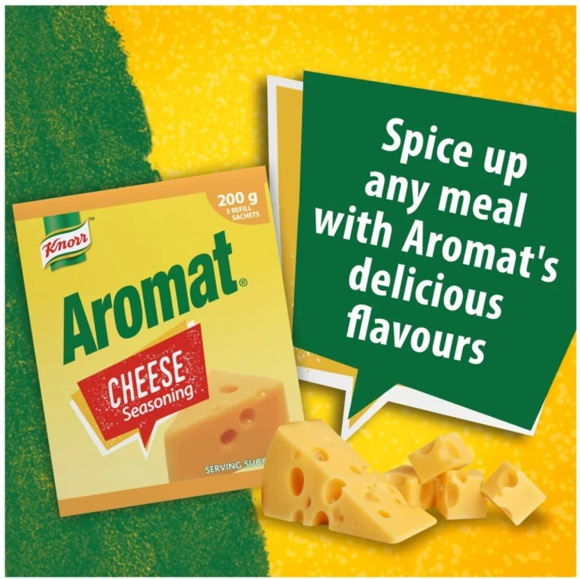 Elevate your everyday meals with the irresistible, savory flavor of Knorr Aromat Cheese Seasoning. This value pack contains 5 large 200g tins, ensuring you always have this versatile flavor booster on hand for sprinkling over pasta, eggs, popcorn, or vegetables.