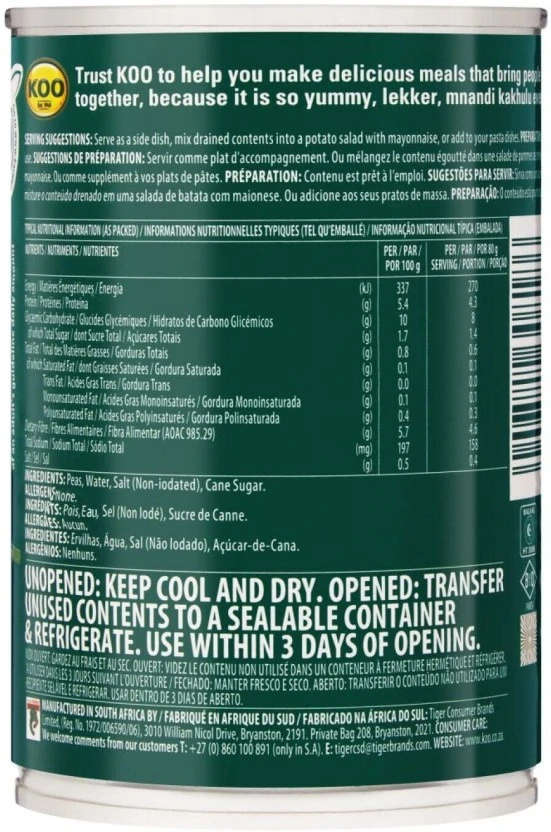 Bring the taste of the garden to your table instantly with KOO Fresh Garden Peas. Packed at the peak of flavor in a convenient 400g single unit, these tender, plump peas are a versatile and healthy staple for any family meal or quick side dish.