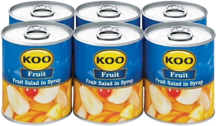 Brand: KOO Type: Salad in Syrup Fruits Size/Pack: 825 g, Pack of 6 Storage Instructions: Store unopened cans in a cool, dry place. Once opened, transfer unused contents to a non-metallic container, refrigerate, and consume within 3 to 4 days. Serving Suggestion: Best served chilled to enhance the natural sweetness and texture of the fruit pieces. Pantry Staple: The long shelf life of canned fruits makes this KOO pack an essential item for everyday meals and emergency kitchen reserves.