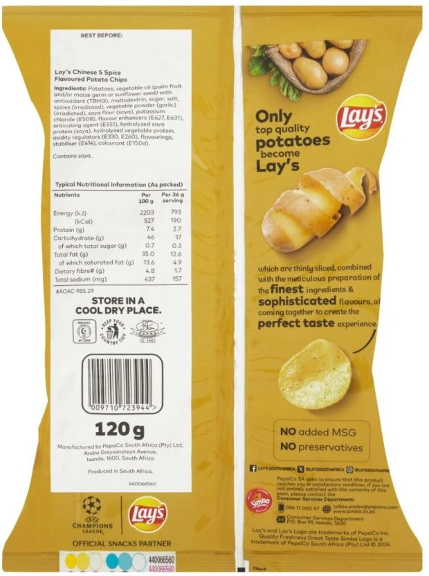 Lay’s Potato Chips Chinese 5 Spice Puffcorn (1 x 120 g) A high-quality product you will enjoy. R30,00 Original price was: R30,00.R25,00Current price is: R25,00. Lay’s Potato Chips Chinese 5 Spice Puffcorn (1 x 120 g) | Shop Online Key Features Top-quality item Perfect for all occasions Reliable brand Convenient size Great value General Information Brand: Lay’s Type: Potato Chips Chinese 5 Spice Puffcorn Size/Pack: 1 x 120 g Use as desired Enjoy fresh and flavorful Suitable for everyone See More