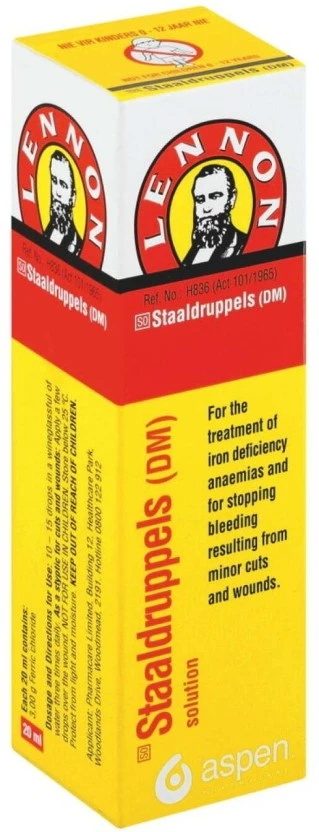 Lennon Staaldruppels is an antiseptic liquid used for wound cleaning and general hygiene, packaged in a 20 ml bottle.
