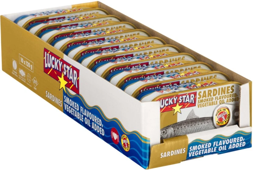 Brand: Lucky Type: Star Sardines Smoked Flavoured Sea Foods Size/Pack: 170 g, Pack of 10 Brand and Product Type: Genuine Star Sardines Smoked Flavoured Sea Foods from the reliable and trusted Lucky brand. Packaging Details: This unit contains 10 easy-to-store tins, each holding 170g net weight of product. Storage Instructions: Store in a cool, dry place. Once opened, transfer unused contents to a non-metallic container, cover, and refrigerate.