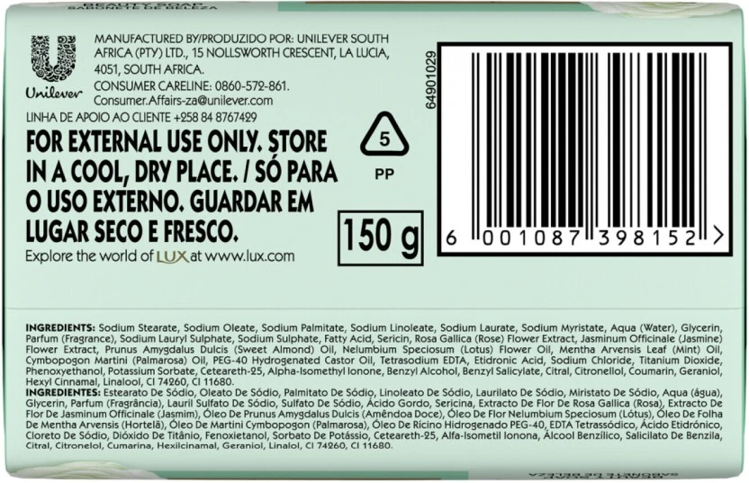 Lux Soap Bar Mint Oil with Waterlily Scent (150 g) | Shop Online A high-quality product you will enjoy. R23,00 Lux Soap Bar Mint Oil with Waterlily Scent (150 g) | Shop Online Key Features Top-quality item Perfect for all occasions Reliable brand Convenient size Great value General Information Brand: LuxType: Soap Bar Mint Oil with Waterlily ScentSize/Pack: 150 gUse as desiredEnjoy fresh and flavorfulSuitable for everyone See More