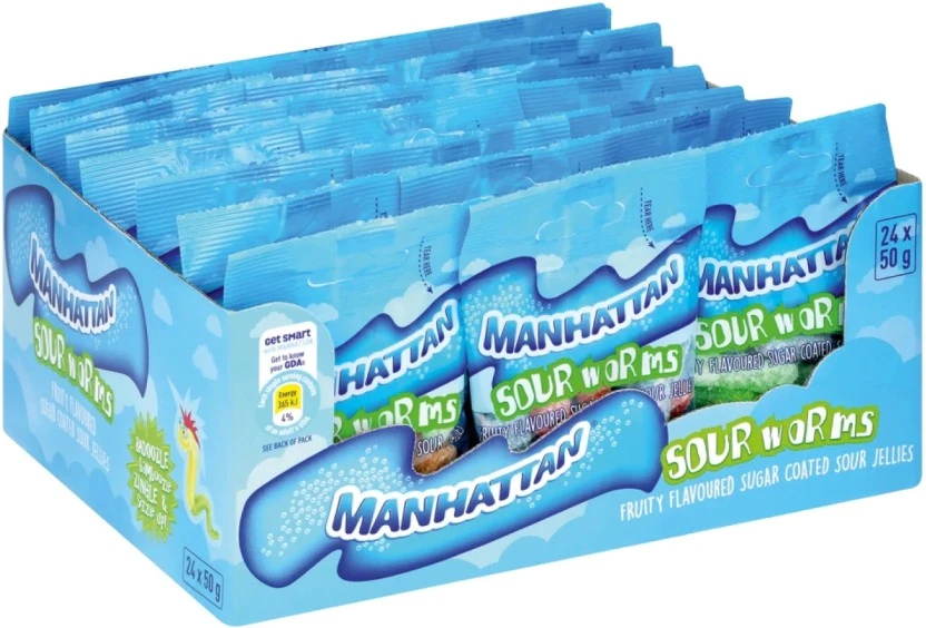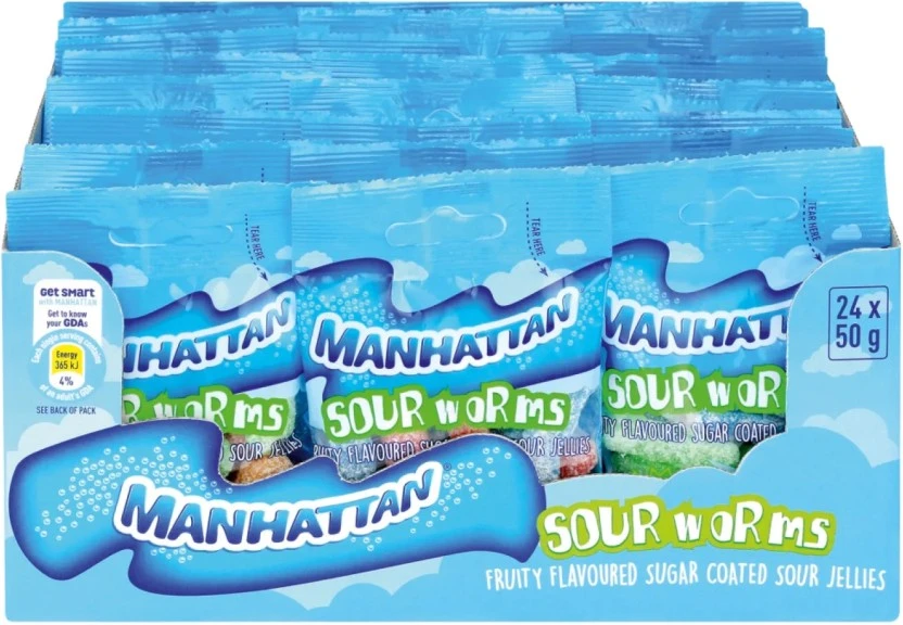 Manhattan Sour Worms Fruity Flavoured Jelly Sweets (Pack of 24 x 50 g) | Shop Online