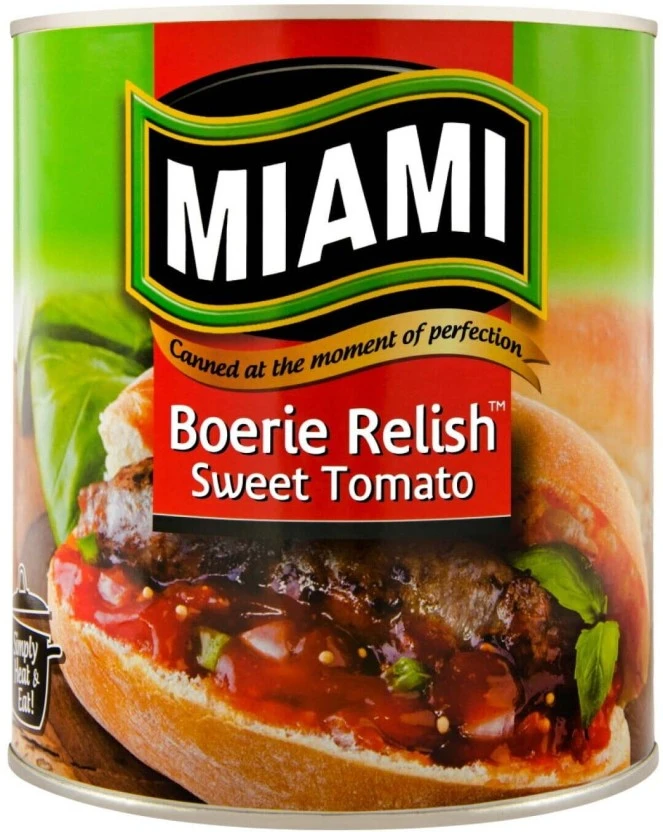Brand: Miami Type: Boerie Relish Vegetables Size/Pack: 3200 g, Pack of 6 Ideal for long-term storage in a cool, dry pantry until needed; please refrigerate contents promptly and consume within seven days after opening. A versatile vegetable-based relish that elevates various dishes, including hamburgers, chicken wraps, gourmet sandwiches, and chips. This offering includes six individual 3.2 kg cans of Miami Boerie Relish Vegetables, providing a total weight of 19.2 kilograms.