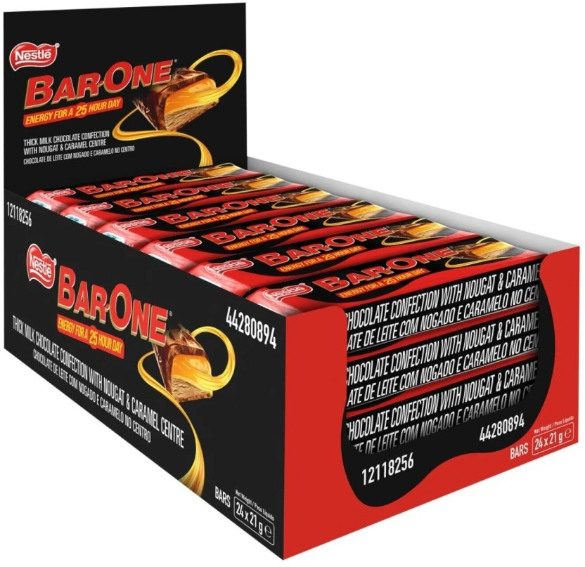 Brand: Nestle Type: Bar One Milk Chocolate Bars Size/Pack: 192 x 21 g Brand Trust: Produced by Nestle, a globally recognized leader in confectionery, guaranteeing consistent quality and trusted taste. Packaging Details: This single unit pack consists of 192 individual 21g standard variant Bar One milk chocolate bars. Product Type: Standard milk chocolate bar featuring caramel and nougat filling.