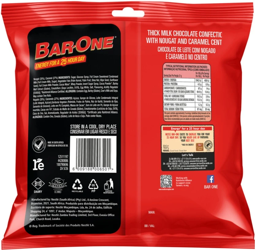 Dive into the deliciousness of Nestle Bar One Minis! This 189g pack is filled with irresistible bite-sized milk chocolate treats, combining the classic Bar One layers of chewy nougat and smooth caramel. Perfect for sharing, snacking, or getting a quick dose of energy, these minis deliver big flavor in every small bite.