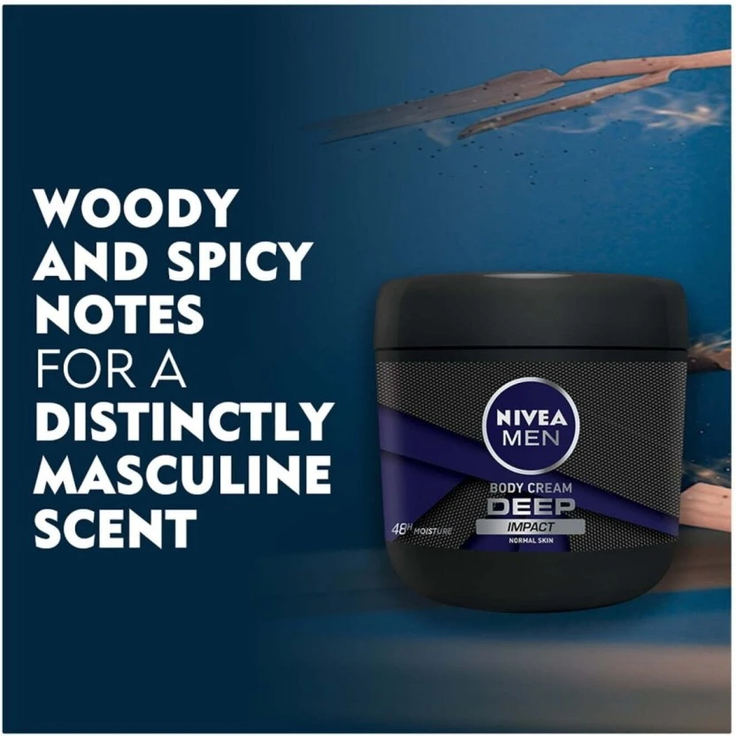Unleash the power of deep hydration tailored for men with Nivea Men Deep Impact Body Cream. This intense, non-greasy formula provides long-lasting moisture and leaves behind a powerful, masculine scent, ensuring your skin stays smooth and protected throughout the day.