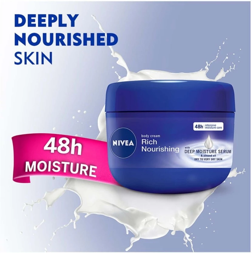 Indulge your skin with the classic NIVEA Rich Nourishing Body Cream (250 ml, Pack of 6). This deeply moisturizing formula, infused with NIVEA Deep Moisture Serum and Natural Almond Oil, delivers 48 hours of intensive care, transforming noticeably dry skin into radiant, soft skin.