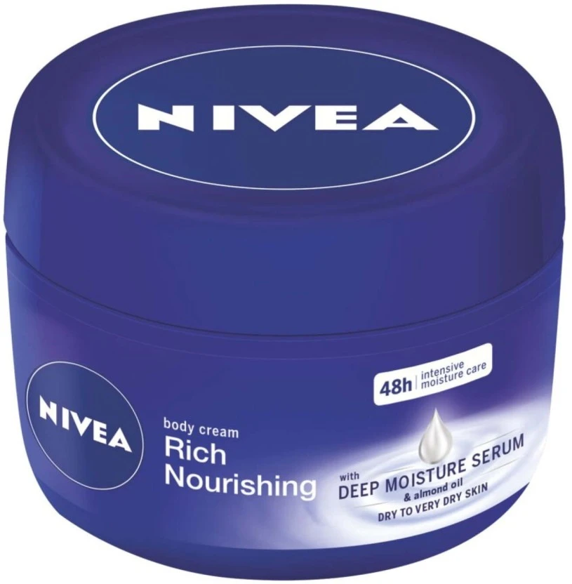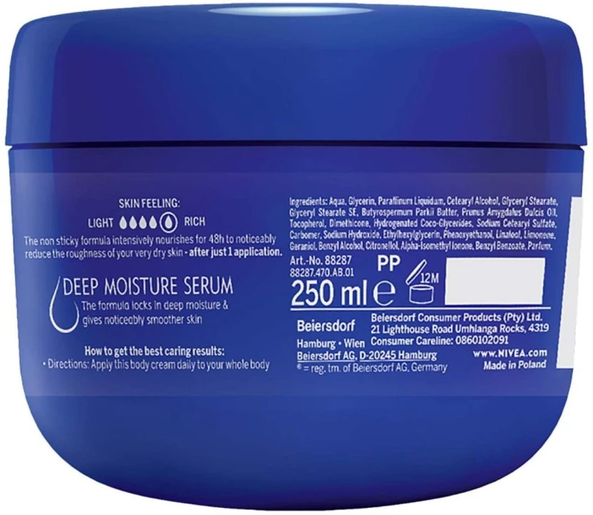 Indulge your skin with the iconic Nivea Rich Nourishing Body Cream. This deeply moisturizing 250ml formula, enriched with NIVEA Deep Moisture Serum and Natural Almond Oil, provides 48 hours of intense hydration, transforming dry skin into smooth, noticeably softer skin. Perfect for daily luxury and lasting comfort.