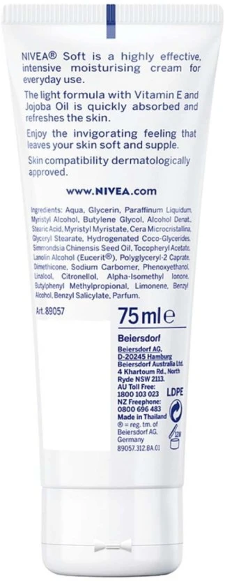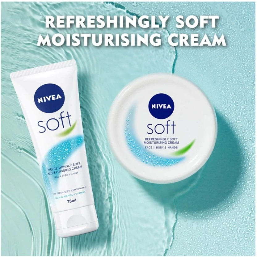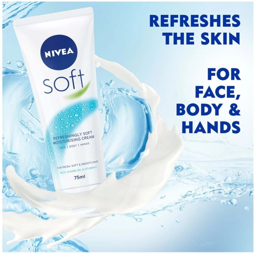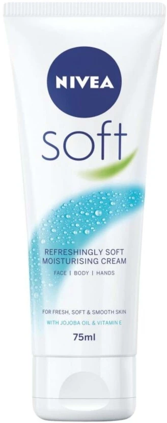 Brand: Nivea Type: Soft Moisturising Cream Size/Pack: 75 ml Product is a single 75 ml unit of the standard Nivea Soft Moisturising Cream variant. Ideal travel size (75 ml) making it perfect for your gym bag, handbag, or carry-on luggage. Trusted Nivea quality, designed for everyday use and suitable for all skin types.