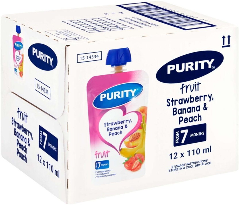 Purity Fruit Puree Mixed Baby Food (110 g) is a smooth puree made from a mix of real fruits, providing a healthy and tasty meal for babies. Comes in a convenient pack of 12 jars.