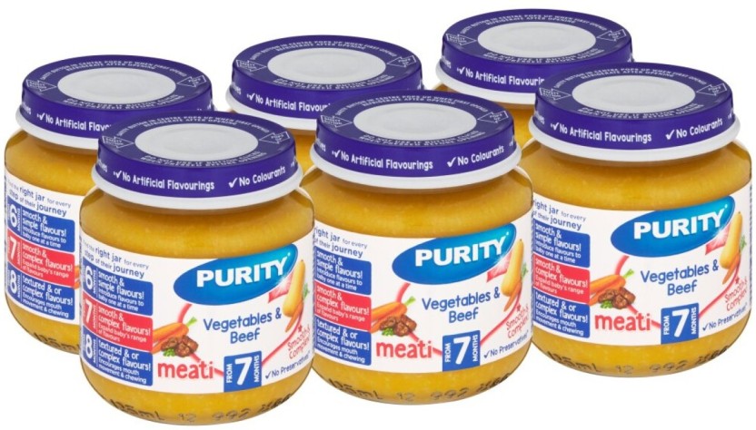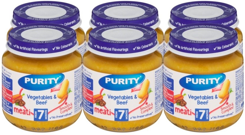 Purity Vegetables & Beef Baby Food (125 g) combines tender beef with mixed vegetables for a nutritious and delicious meal. Comes in a pack of 6 jars for convenience.