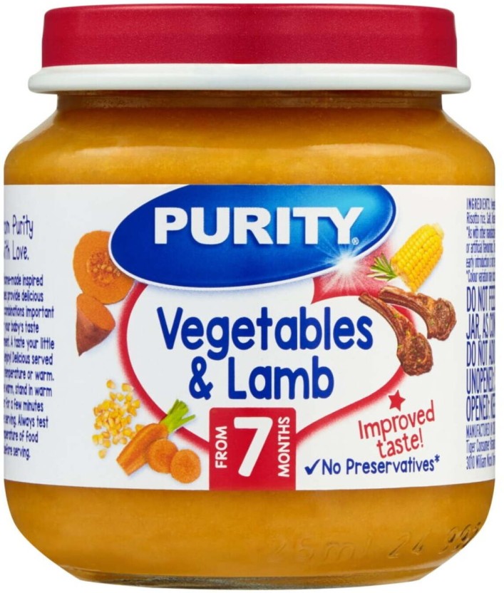 Purity Vegetables & Lamb Baby Food (125 g) combines tender lamb with fresh vegetables for a nutritious and delicious meal. Suitable for introducing protein and vegetables to babies.