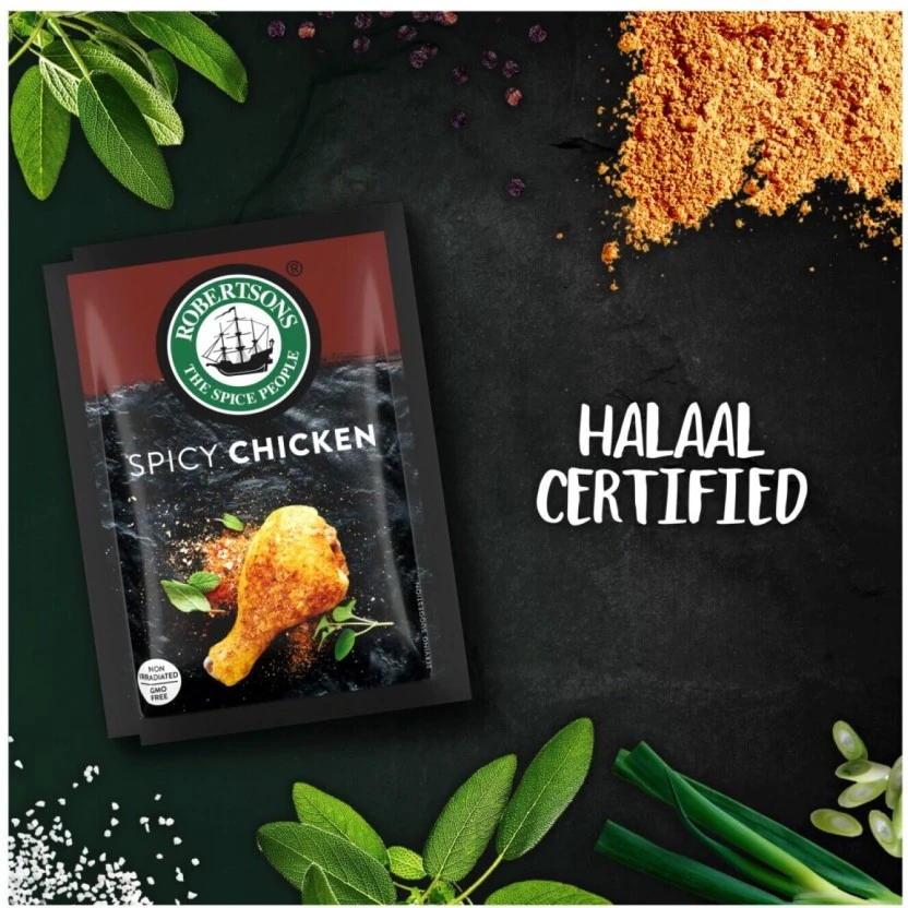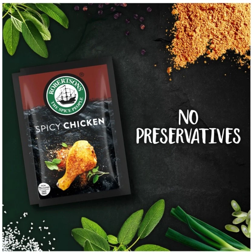 Ignite your kitchen with Robertson's Spicy Chicken seasoning! This expertly blended mix delivers an intense, aromatic heat that transforms everyday chicken into a fiery masterpiece. Pre-portioned in 6 convenient 7g sachets, achieving consistently delicious and spicy results has never been easier for grilling, roasting, and frying.