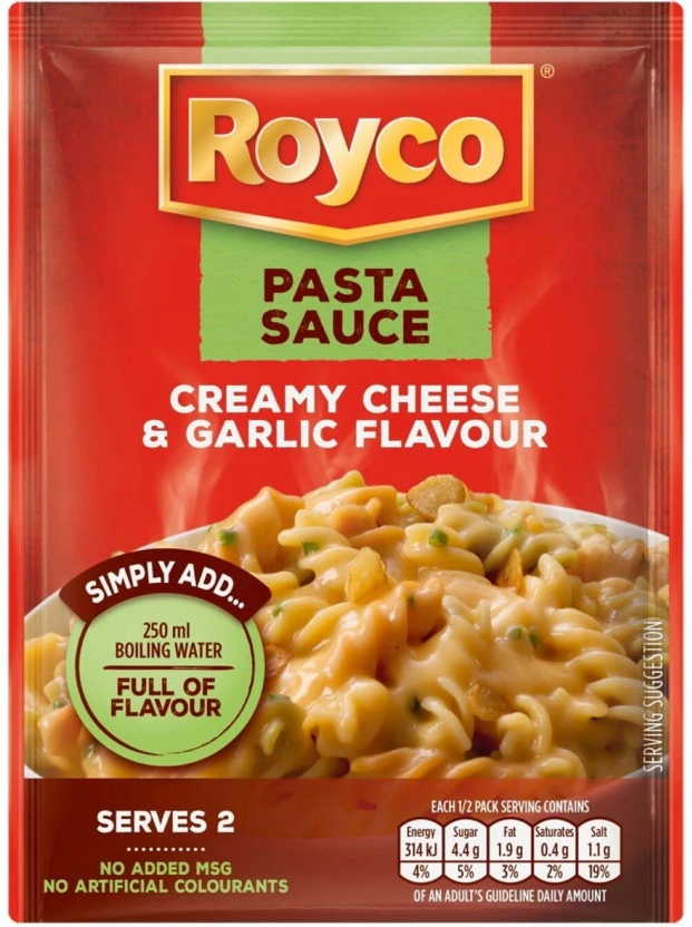 Transform your weeknight dinner into an Italian feast with the Royco Creamy Cheese & Garlic Flavour Pasta Sauce Mix. This convenient 45g packet delivers a rich, savory, and restaurant-quality sauce in minutes, perfect for busy schedules without sacrificing that authentic creamy taste.