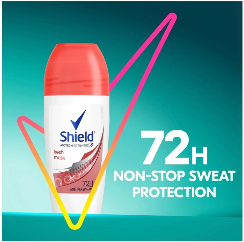 This product is the Shield Fresh Musk Deodorant Roll-on, packaged in a compact 50 ml size, perfect for daily use or travel.