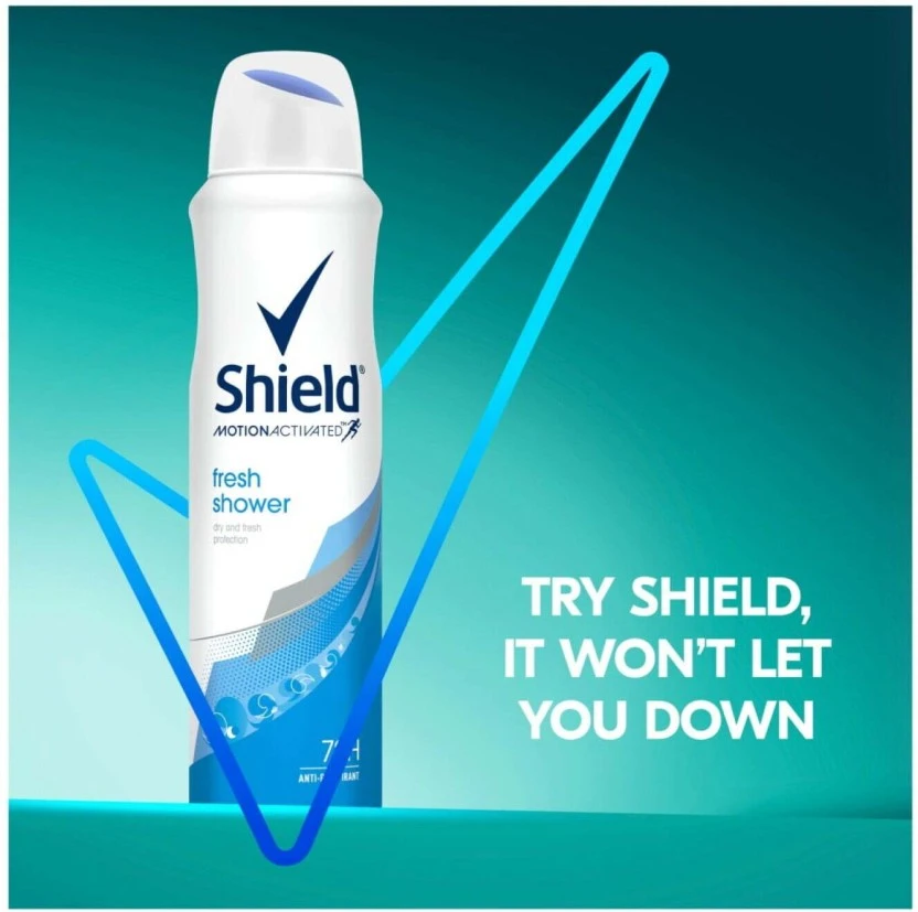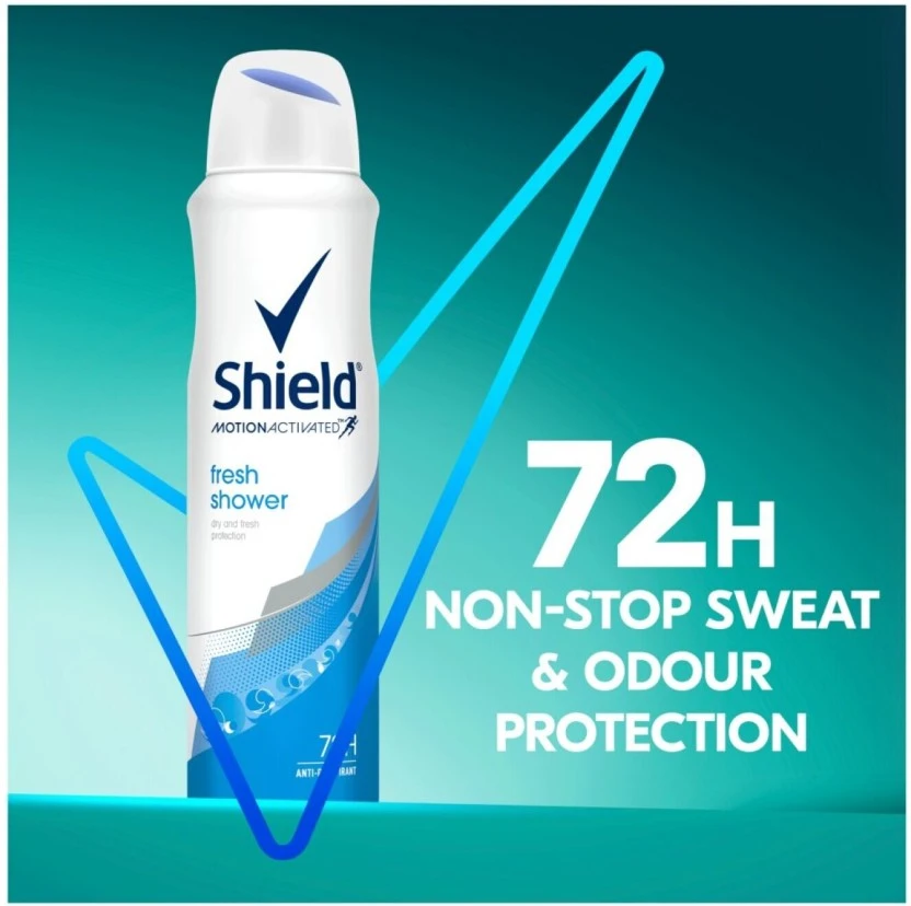 Experience unstoppable confidence with Shield Motion Activated Fresh Shower Deodorant Spray for Women. This 150ml high-performance antiperspirant uses revolutionary MotionSense technology, releasing a continuous burst of clean, 'fresh shower' fragrance exactly when your body needs it most, providing 48 hours of protection against sweat and odor.
