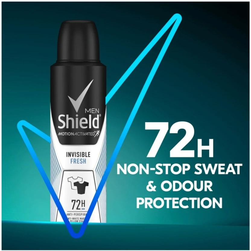 Conquer your day with the Shield Motion Activated Invisible Fresh Deodorant Spray for Men. Featuring groundbreaking MotionSense technology, this 150ml aerosol releases a dynamic blast of freshness the moment you start moving. Enjoy superior 48-hour odor and wetness protection combined with an invisible formula that keeps clothes mark-free, guaranteeing confidence from your first move until your last.