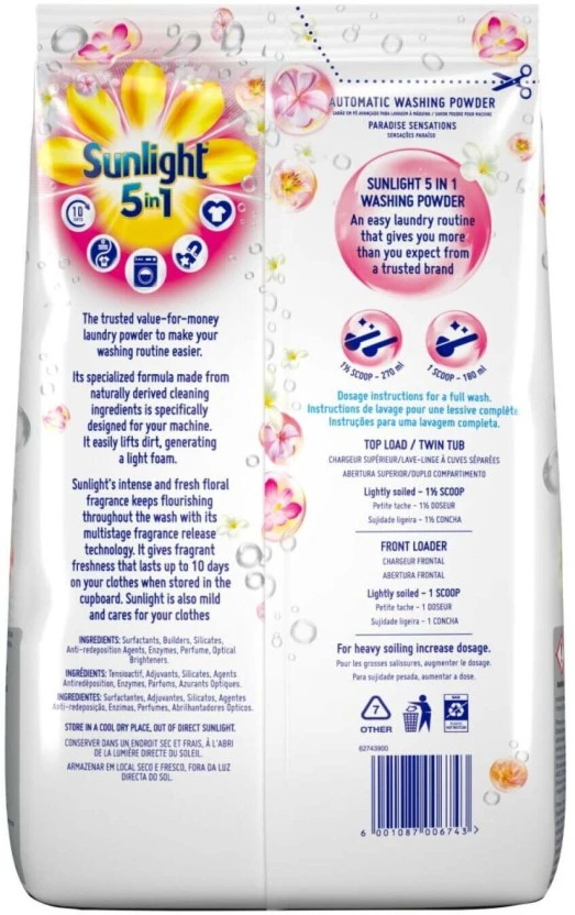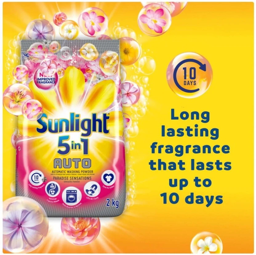 Experience laundry paradise with Sunlight 5-in-1 Paradise Sensations Washing Powder! This powerful 2kg detergent delivers a brilliant, deep clean while infusing your clothes with an exotic, long-lasting tropical fragrance. It tackles tough stains, brightens colors, and makes every wash a refreshing sensory experience.