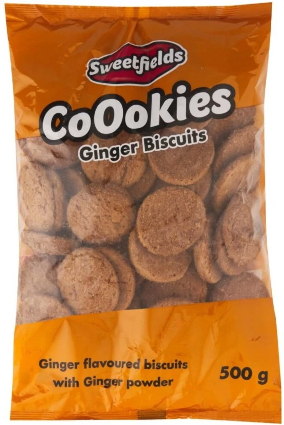 Product is a single unit of standard Sweetfields Ginger Flavoured Cookies, weighing 500 grams.