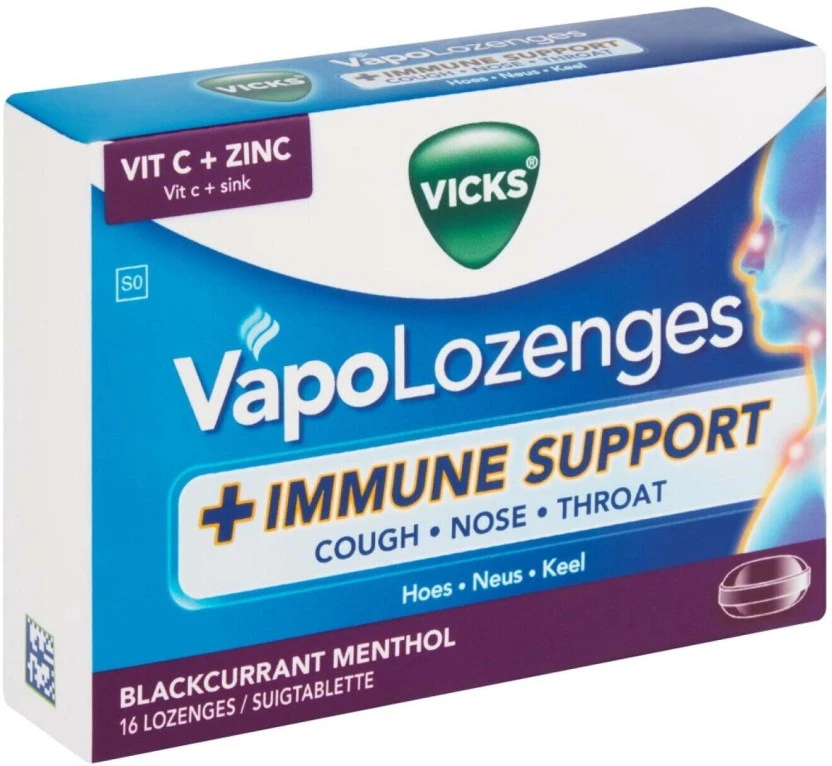 Vicks Immune Support Lozenges with Blackcurrant flavor help support the immune system and soothe the throat. Pack contains 16 lozenges.